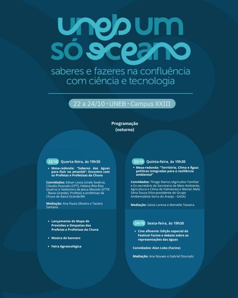 A abertura acontece no dia 22 de outubro, às 19h30, com a mesa-redonda “Saberes das águas para fluir no amanhã”, que contará com a presença dos Profetas e Profetisas da Chuva de Baixa Grande, além de representantes de organizações locais e docentes da UNEB. Na ocasião, será lançado o Mapa de Previsões e Simpatias dos Profetas e Profetisas da Chuva, iniciativa que reconhece e registra práticas populares de leitura da natureza como parte do patrimônio imaterial e do conhecimento ambiental dos povos da região. Haverá, ainda, a Feira Agroecológica da Uneb com exposição e venda de produtos locais a partir das 14h.