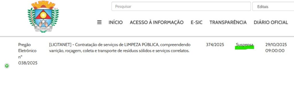 A Prefeitura de Seabra, na Chapada Diamantina, sob gestão de Neto da Pousada(PCdoB), anunciou a suspensão do pregão eletrônico nº 038/2025, que previa a contratação de empresa para serviços de limpeza pública, incluindo varrição, roçagem, poda de árvores e coleta de resíduos.