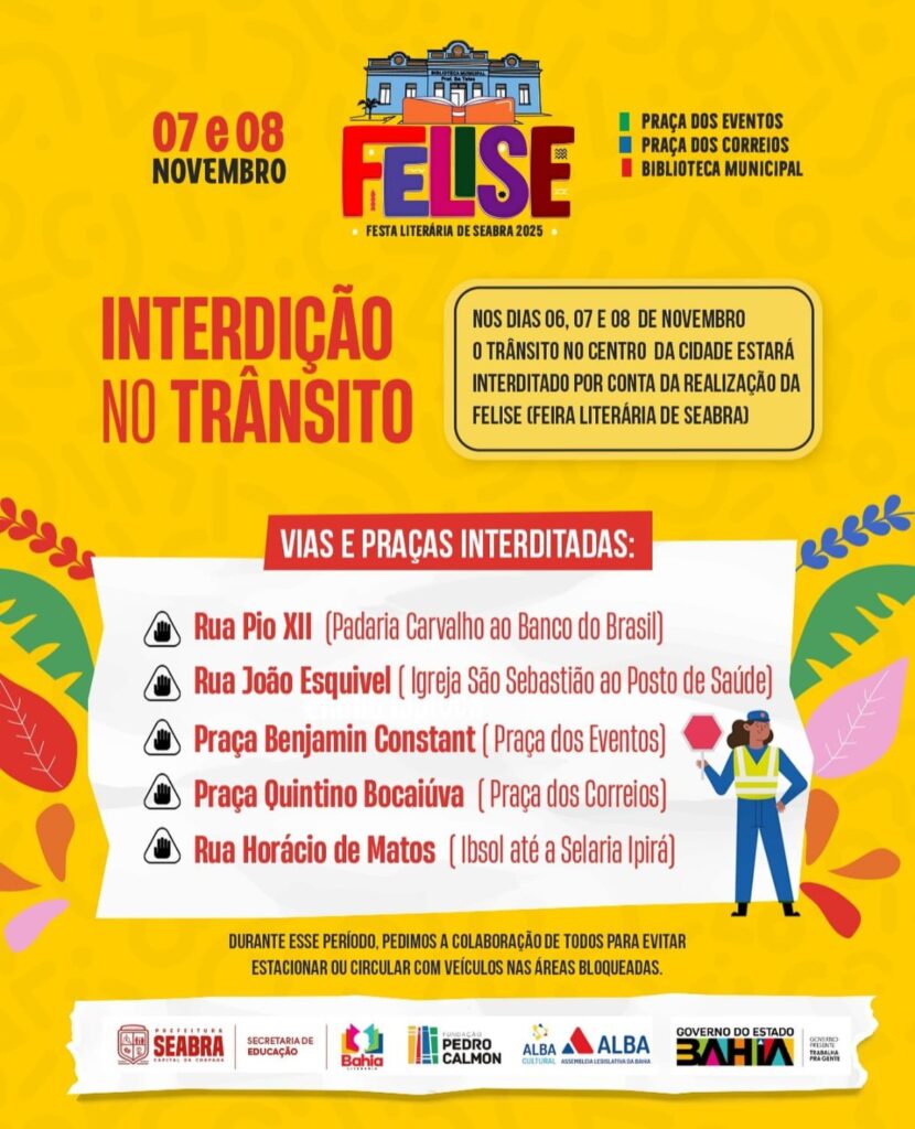 Em comunicado, a Prefeitura de Seabra informou que o trânsito no centro da cidade será interditado entre os dias 6 e 8 de novembro, durante a realização da FELISE – Festa Literária de Seabra 2025.