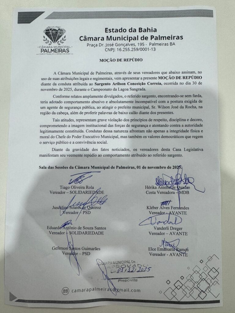 A conduta foi considerada grave pelos parlamentares, que decidiram formalizar o repúdio em documento oficial. A moção foi assinada por oito vereadores e vereadoras, reforçando a posição da Casa Legislativa em defesa da integridade física e moral do chefe do Executivo e dos valores democráticos.