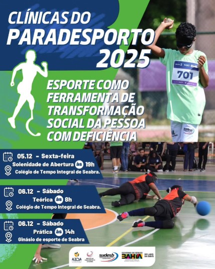 A cidade de Seabra, na Chapada Diamantina, receberá a oitava etapa das Clínicas do Paradesporto 2025 nesta sexta e sábado, 5 e 6 de dezembro, com atividades teóricas e práticas. A programação acontecerá no Colégio Estadual de Seabra – Tempo Integral (CES) e no Ginásio de Esportes. A solenidade de abertura ocorrerá nesta sexta-feira, 5, às 19h, no CES.