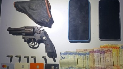 Durante a busca no interior do automóvel, os policiais encontraram um revólver calibre .32, contendo cinco cartuchos intactos e um deflagrado, além de dois aparelhos celulares e dinheiro em espécie. Ainda segundo os policiais, o condutor e a passageira foram abordados sem que houvesse necessidade de uso da força.