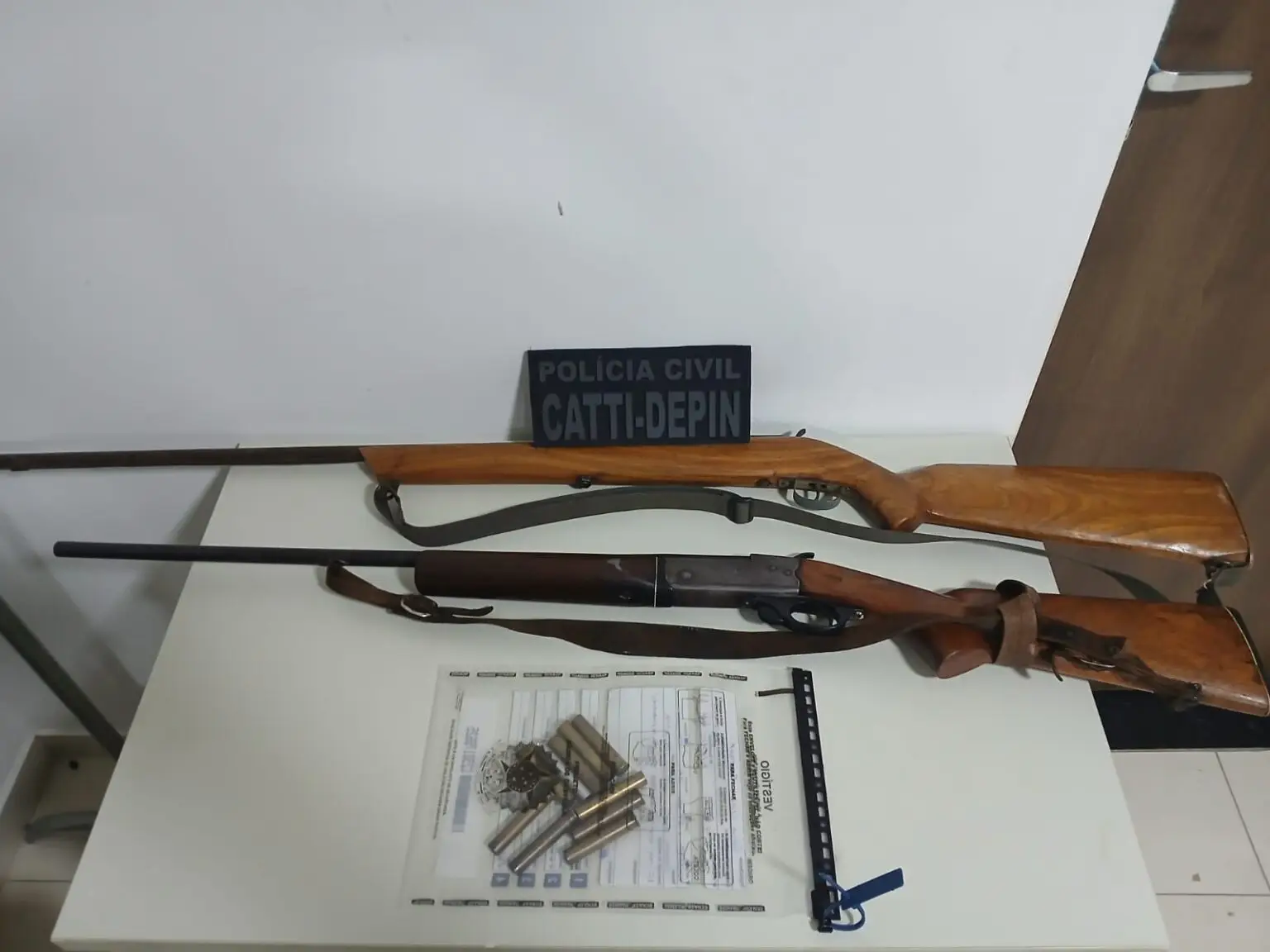 Segundo os policiais, durante a ação, o principal suspeito do crime foi localizado e estava em posse de duas armas de fogo do tipo espingarda, sendo que uma delas teria sido utilizada no delito investigado.