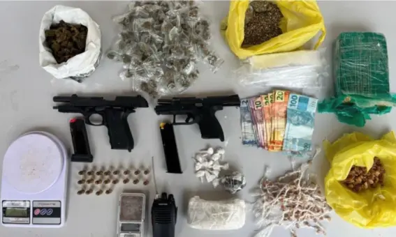 No imóvel, foram apreendidas duas pistolas calibre 9mm, 20 munições intactas, além de porções de crack, maconha e cocaína. Também foram recolhidos balanças de precisão, rádio comunicador, sementes de maconha e dinheiro em espécie.