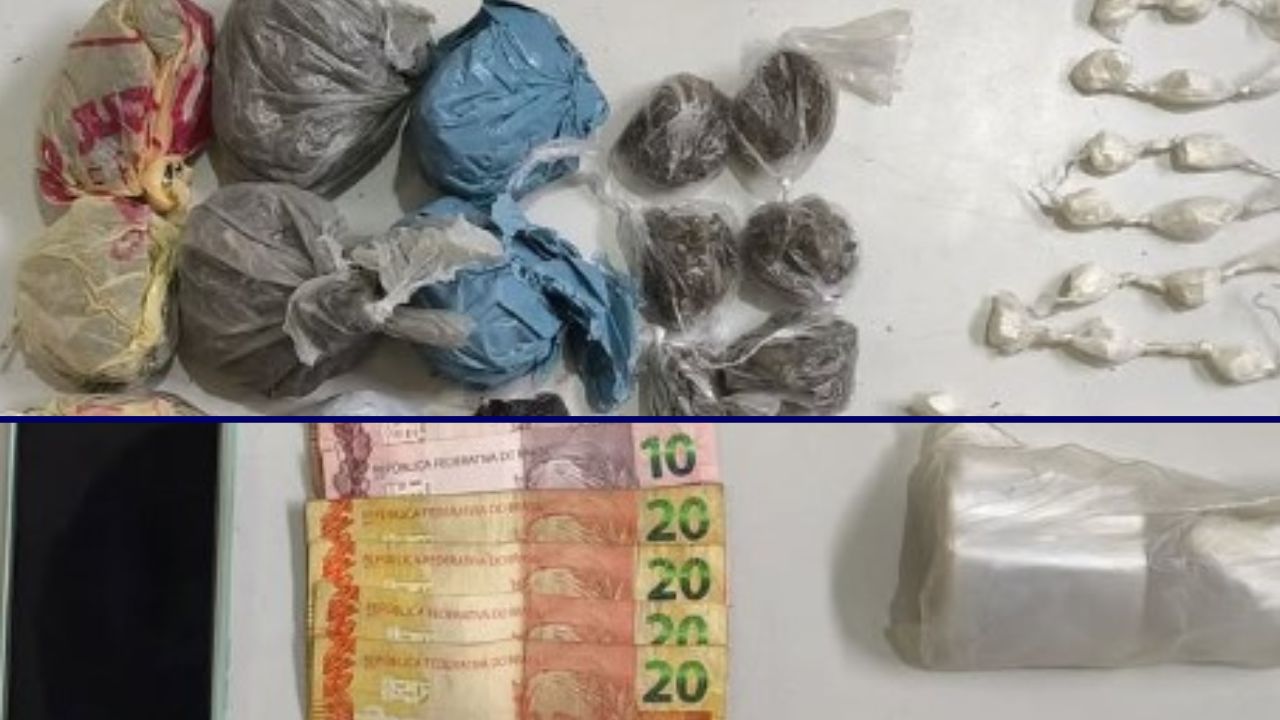 Com o indivíduo foram encontradas porções de substâncias análogas à maconha e à cocaína, além de dinheiro em espécie, embalagens utilizadas para acondicionamento de drogas e um aparelho celular.
