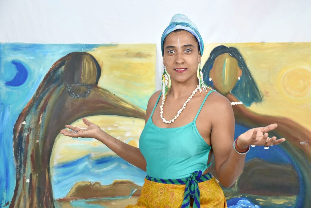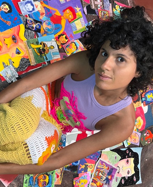 Fundadora do Kilumbu Criativo Cazulo Amarelo e curadora da Yúna Galeria e Ateliê, Jùjú Nsaa manifesta em sua arte o poder da criação como cura e continuidade. Sua estética é viva, intuitiva e ritualística: uma pintura que dança, canta e reza.