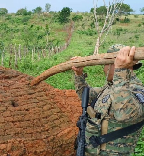 No povoado de Bate Tambor, em Nova Redenção, os policiais identificaram um forno utilizado para produção clandestina de carvão vegetal. O equipamento foi destruído, já que a prática configura crime ambiental. O responsável pela atividade não foi localizado.