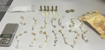 Segundo os policiais, durante a ação foram encontrados entorpecentes, balança de precisão, munições calibre .38 e uma quantia em dinheiro.