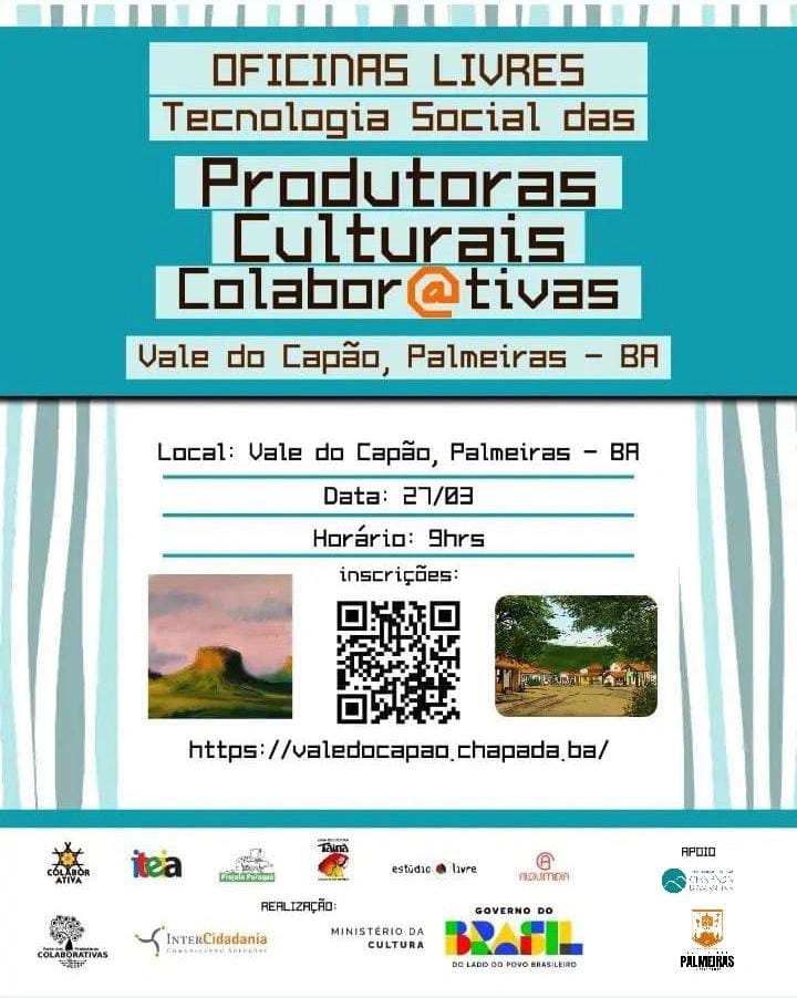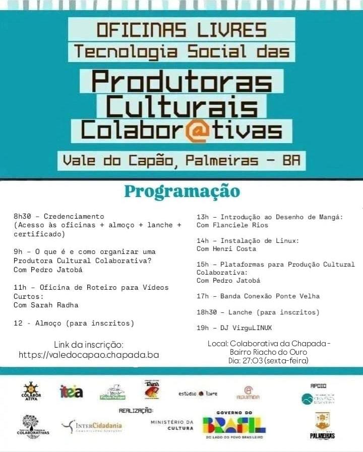 Aberto a toda comunidade, o evento, produzido pelo Pontão de Cultura Digital e Mídias Livres da Rede das Produtoras Culturais Colaborativas, pela Produtora Colaborativa da Chapada e Instituto Intercidadania, é voltado especialmente para quem já atua na cena cultural do Vale ou deseja se aproximar dela. Além das atividades, os inscritos pelo link oficial terão direito a almoço incluso, reforçando a ideia de uma experiência completa, que se estende da manhã até a noite.