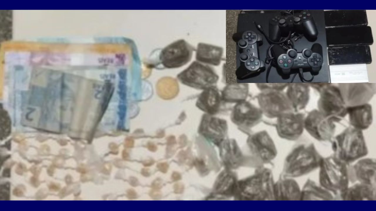 Segundo a polícia, na abordagem foram encontrados 47 trouxas de maconha, 52 pedras de crack, 12 trouxas de cocaína, além de três aparelhos celulares, um videogame PlayStation 3, um carregador externo, R$ 132,85 em espécie e a mochila utilizada pelo suspeito.