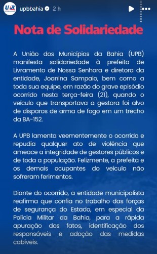 A União dos Municípios da Bahia (UPB) emitiu uma nota de solidariedade por meio das redes sociais, em que lamenta o ocorrido e repudia atos de violência contra gestores públicos. O órgão afirma estar confiante no trabalho da polícia em identificar os envolvidos.